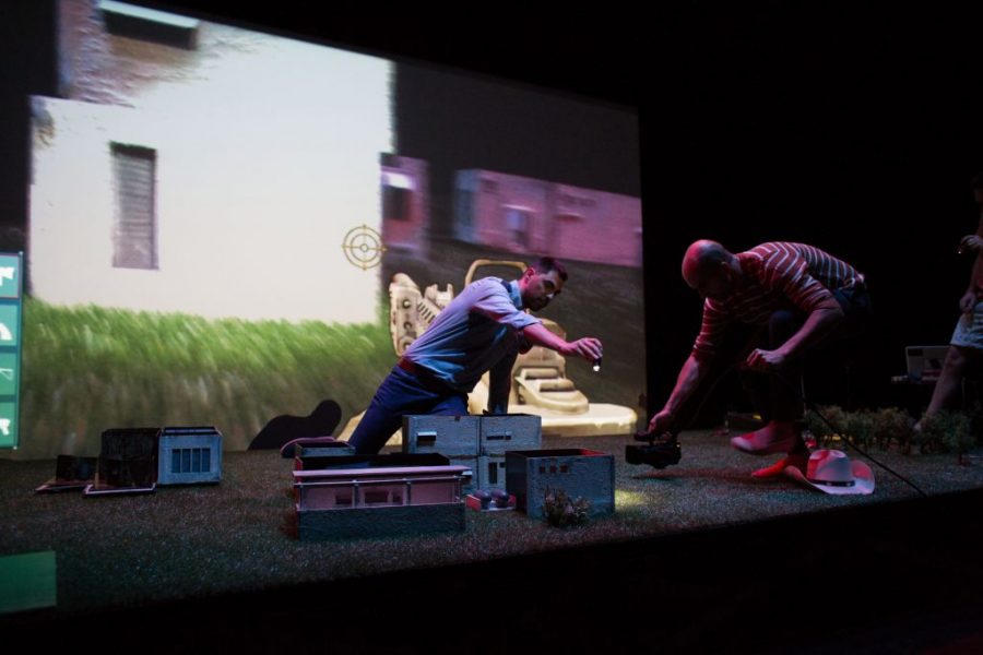 “Zoomed in” is the operative phrase, too. Their storytelling media are toy soldiers and a doll’s house reconstruction of Bin Laden’s Abbottabad compound, filmed in close-up on the stage and projected.
